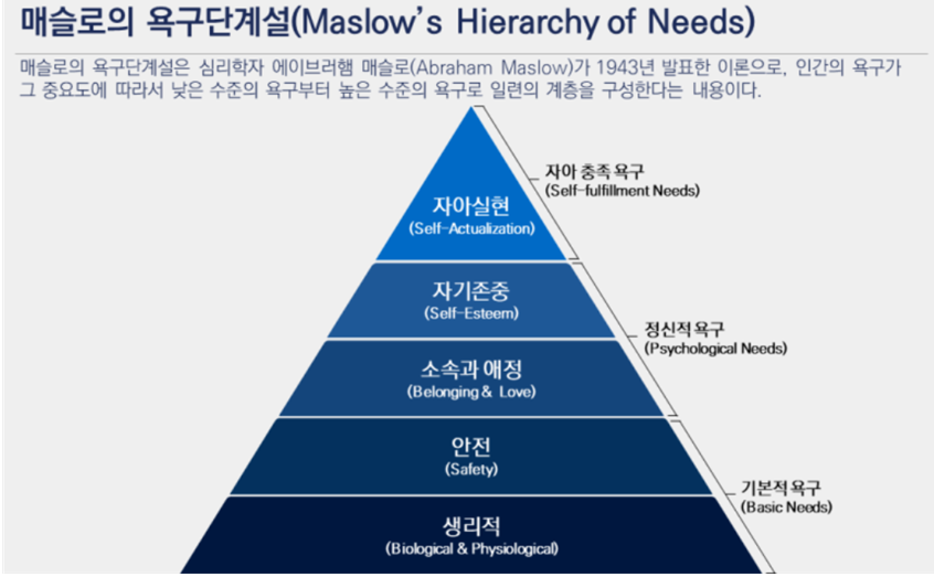 매슬로우의 욕구계층이론은 총 다섯 단계로 이루어진 피라미드 형태의 구조로 설명됩니다. 이 이론에 따르면 인간은 가장 기본적인 생리적 욕구에서 시작하여 자아실현에 이르기까지 점진적으로 상위 욕구를 추구하게 됩니다.
